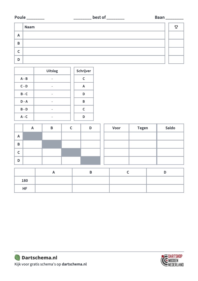 Geen beschikking over internet of computer? Het kan ook gewoon met pen en papier. Print alvorens het toernooi een aantal schema’s uit en neem deze mee naar het toernooi.